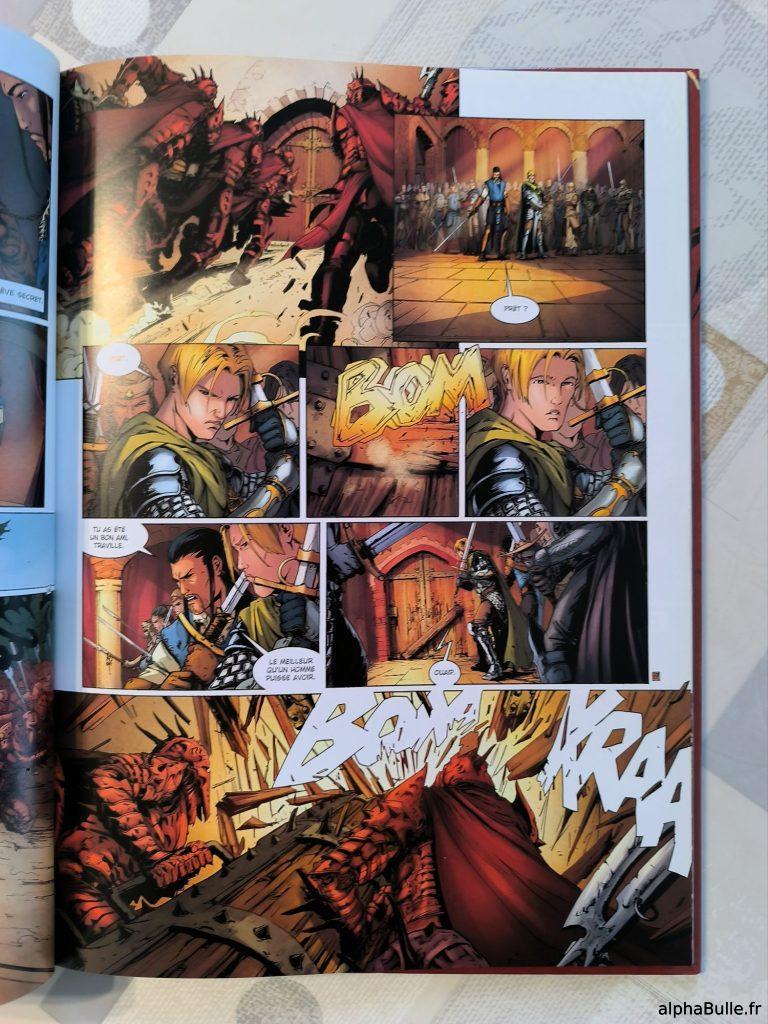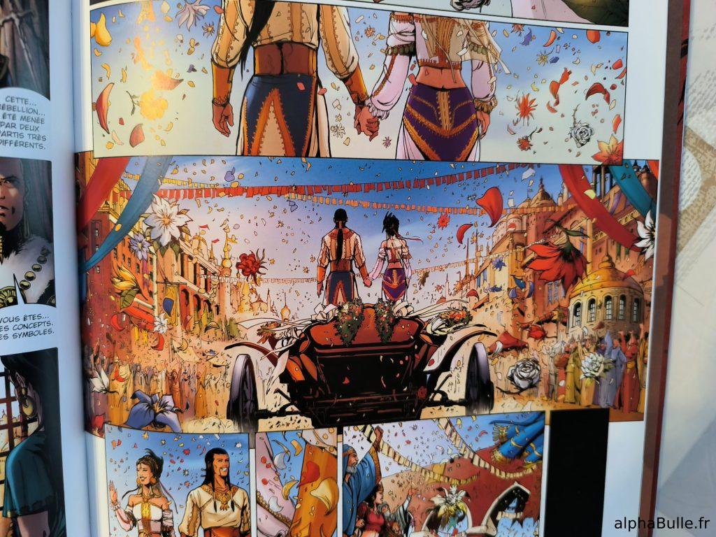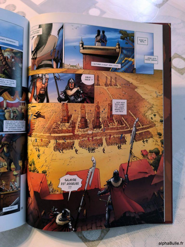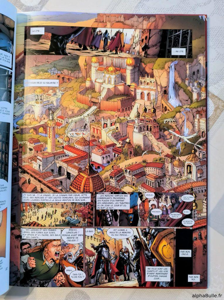 Visuellement, le tome impressionne. Le dessin, nerveux mais précis, excelle dans les scènes d’action à la lisibilité exemplaire. Les pages de présentation de Salmyre ou de son siège (cf exemples, cf. ci-dessus) se distinguent par une composition maîtrisée qui sait taper dans l’oeil ! Les couleurs sont globalement chaudes, évoquant le sud de ce monde, mais également conforme à la charte globale de la série. Le charadesign est également parfait, posant facilement les personnages dés leurs introductions.