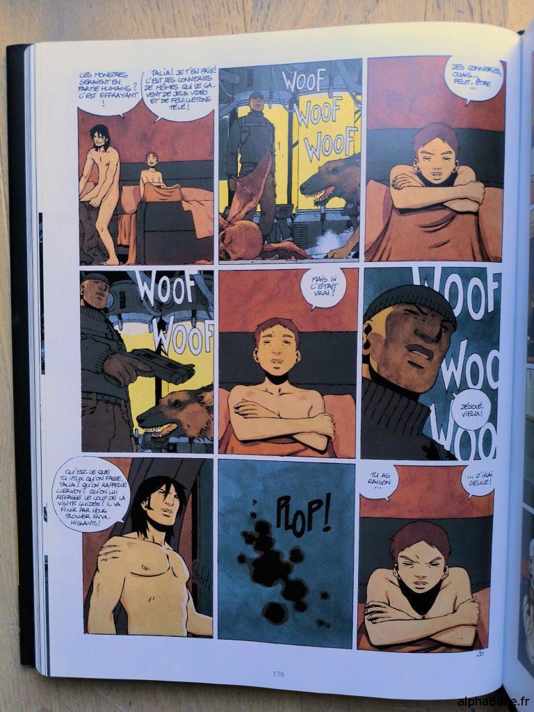 Le dessin est fonctionnel, et retrouve de l’inspiration avec une double-page impressionnante (reprise en couverture) ainsi que plusieurs compositions intelligentes comme celle qui alterne les vignettes d’un même gaufrier, offrant un effet semblable à celui que j’avais détaillé dans cet article (composition visible ci-dessus).