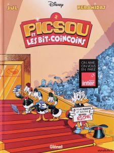 L’album Picsou et les Bit-Coincoins prétend épingler les excès d’un monde actuel1 gouverné par les réseaux sociaux, le culte de l’apparence et la blockchain. Pourtant, l’ensemble se résume à une série de péripéties sans réel liant, comme si les auteurs s’étaient contentés d’accumuler des sujets d’actualité, loin d’être inintéressants (!) mais sans jamais vraiment en interroger les mécanismes. Il faut reconnaitre que pour un album jeunesse de 48 pages, c’était sans doute un peu optimiste… Les cryptomonnaies (largement mises en avant dans le marketing de l’album) ne sont finalement ici qu’un décor, un prétexte, une façade technologique presque trompeuse2.