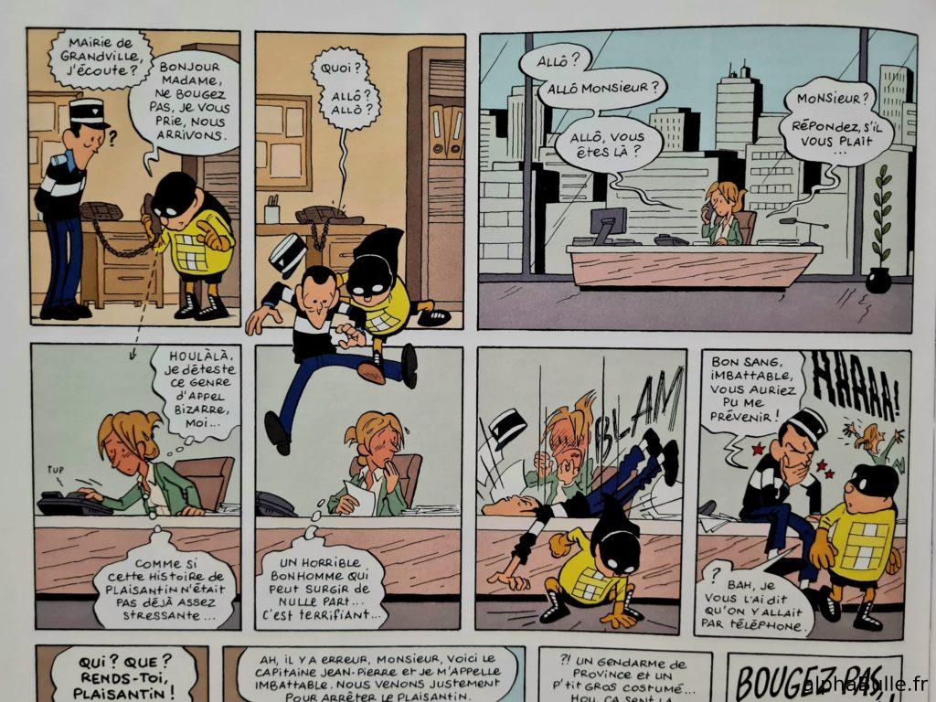 Rendant hommage au parti pris de la BD, qui est donc de déchirer la causalité, peut-être aurez-vous noté que cette critique du tome #1 arrive après celle du tome #2 ! De ce fait, nous retrouvons découvrons pépé Cochonnet, Toudi3, le Savant Fou, ainsi que le très bon Plaisantin (et leur ribambelle de pouvoirs également liés à la nature de la BD). L’on notera aussi l’humour au service de la narration : Imbattable utilise un téléphone ou la lecture d’un livre pour s’assurer que la vignette suivante montrera un lieu différent, lui permettant ainsi de s’y téléporter. Une belle trouvaille.