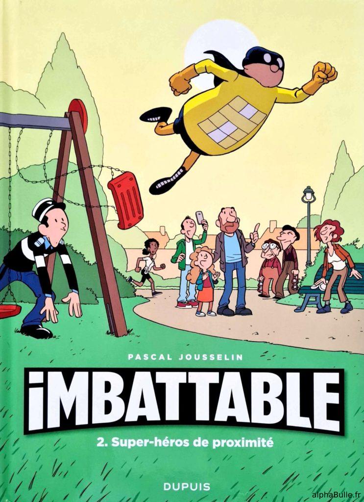 Suivant le super-héros franchouillard éponyme, l’album (ici, le second) nous dépeint toutes sortes d’aventures de longueur variant d’une page à une bonne dizaine 1. Celles-ci mettent systématiquement à l’honneur le super-pouvoir d’Imbattable : celui de se déplacer géographiquement d’une vignette de BD à une autre, au sein d’une page (ou d’une double page) ; notez qu’il peut également faire voyager des objets ou des personnages de la même manière. Vous l’aurez compris, nous sommes donc en présence d’historiette humoristiques absurdes par nature.