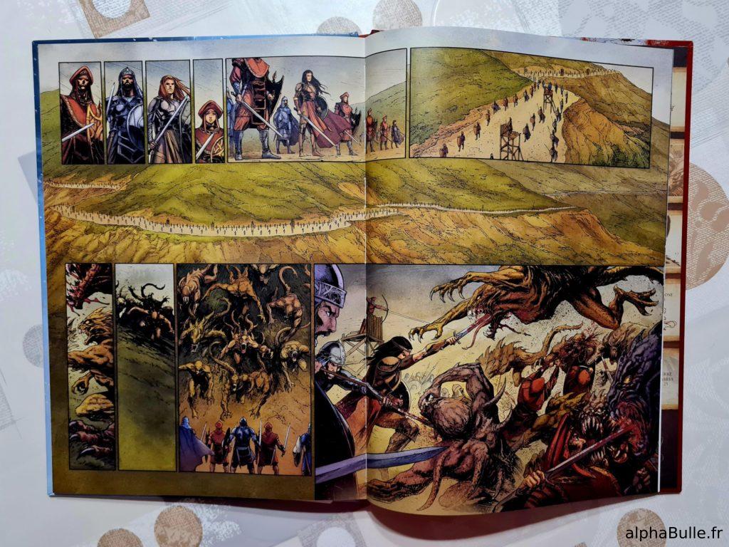 L’excellent tome #32 de la Geste des Chevaliers Dragon propose en climax de son récit la défense d’une route, organisée conjointement par des Chevaliers Dragons ainsi que des Gardiens de la Route, face au créatures de Veil. Afin de l’illustrer, après une montée en tension parfaitement induite par la narration, une double-page somptueuse nous est proposée :