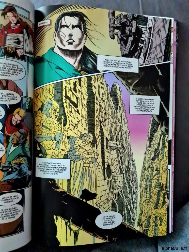 A gauche, une somptueuse double page que l’on trouve dés le début de l’ouvrage, proposant trois longue vignettes horizontales. Celles-ci nous montrent le désespoir des forces de la république, comme écrasée par les gouttières, tandis que les poings du seigneur noir Sadow soulignent l’usage qu’il fait de la Force. A droite, Exar Kun découvre les anciens tombeaux des Sith sur Korriban, avec une composition soulignant la différence d’échelle entre la frêle silhouette du Jedi et l’écrasante planète-cimetière.