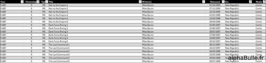 | VO : 1991 VF : 1992 | L’héritier de l’Empire | VO : 1995 VF2 : 1995 | L’héritier de l’Empire – Vol. 1 | Mike Baron Olivier Vatine Isabelle Rabarot |