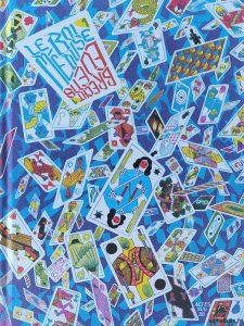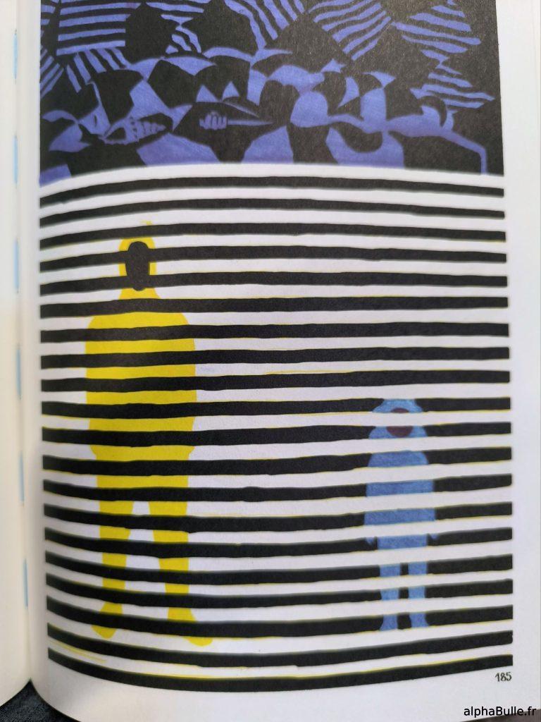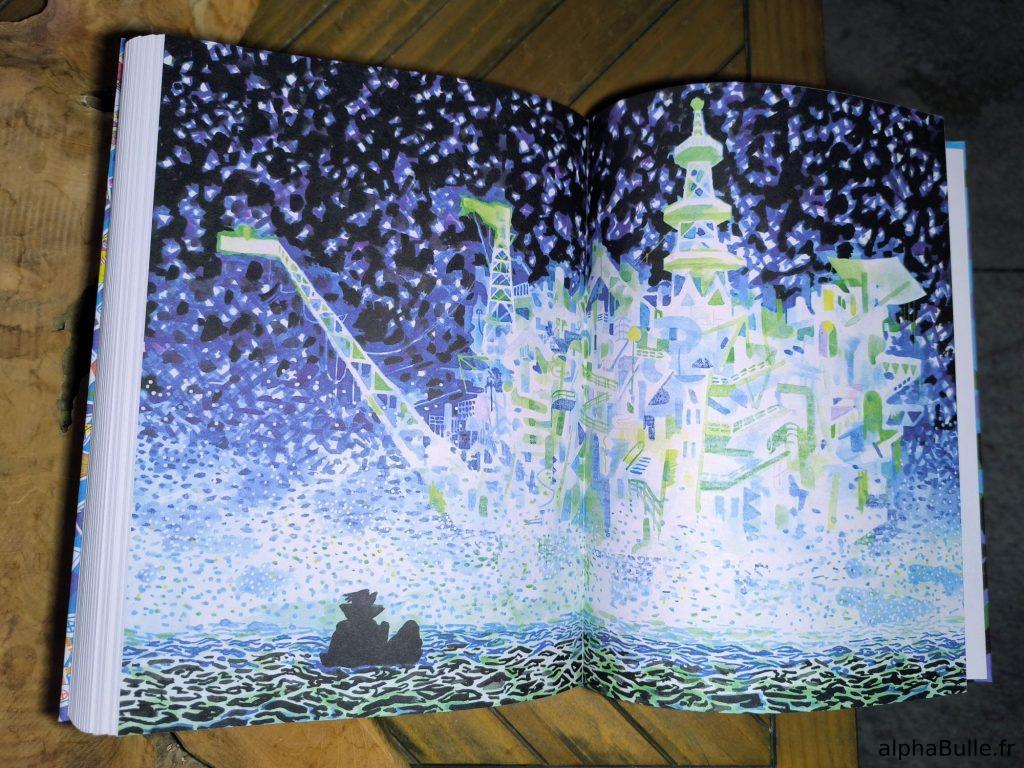Sur la forme, le style est très clivant (et je doit reconnaitre que je n’adhère pas trop). L’auteur emploie tantôt des éléments figuratifs et simples pour nombre de ses illustrations (par exemples, les visages sont parfois dépourvus de traits) tout en proposant tantôt des illustrations extrêmement détaillée 2, foisonant de dizaines de détails dans lesquels le regard du lecteur se perd plus ou moins volontairement. Libre de toute contrainte de cohérence, le dessin fait appel à tout le spectre des couleurs sur tous ses aspects, des bâtiments aux personnages, des objets aux paysages… et même parfois pour des illustrations purement abstraites. De même, toutes les formes géométriques sont convoquées, y compris pour donner aux personnages des allures de gnomes, de démons, de mannequins ou de robots… L’auteur use également très habilement avec de nombreux jeux de transparence.