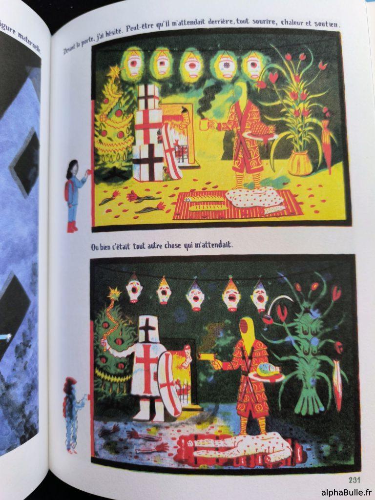 Sur la forme, le style est très clivant (et je doit reconnaitre que je n’adhère pas trop). L’auteur emploie tantôt des éléments figuratifs et simples pour nombre de ses illustrations (par exemples, les visages sont parfois dépourvus de traits) tout en proposant tantôt des illustrations extrêmement détaillée 2, foisonant de dizaines de détails dans lesquels le regard du lecteur se perd plus ou moins volontairement. Libre de toute contrainte de cohérence, le dessin fait appel à tout le spectre des couleurs sur tous ses aspects, des bâtiments aux personnages, des objets aux paysages… et même parfois pour des illustrations purement abstraites. De même, toutes les formes géométriques sont convoquées, y compris pour donner aux personnages des allures de gnomes, de démons, de mannequins ou de robots… L’auteur use également très habilement avec de nombreux jeux de transparence.