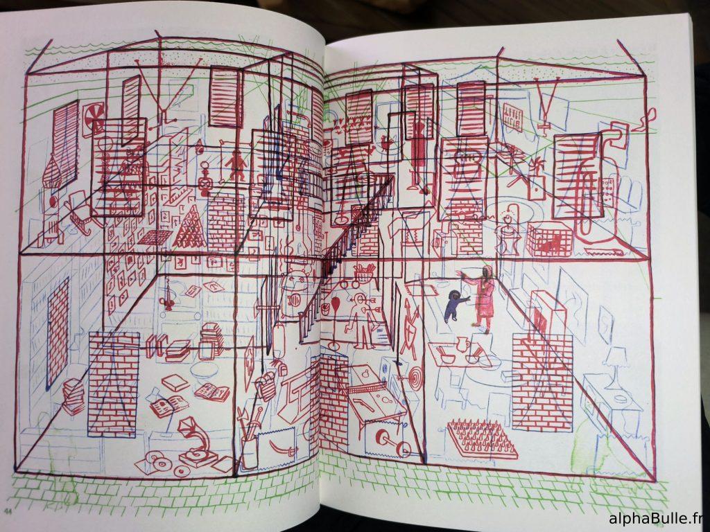 • La maison d’Arthur est présentée sous la forme d’un plan en double page. Mais pas un schéma technique, plutôt une superposition de détails et de perspectives géométriques qui transmettent beaucoup plus d’impressions que d’informations ;