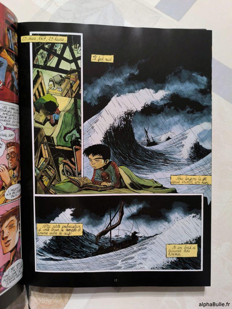 Visuellement, l’adhésion reste partielle. Si le charadesign se révèle fonctionnel mais peu inspiré, les décors sont en revanche somptueux. Certaines planches impressionnent par leur composition : grandes vignettes à bords perdus, superpositions d’actions éloignées dans le temps et l’espace, ou encore cette double page remarquable consacrée au rituel issu du journal découvert par Quentin, sur laquelle je reviendrai…