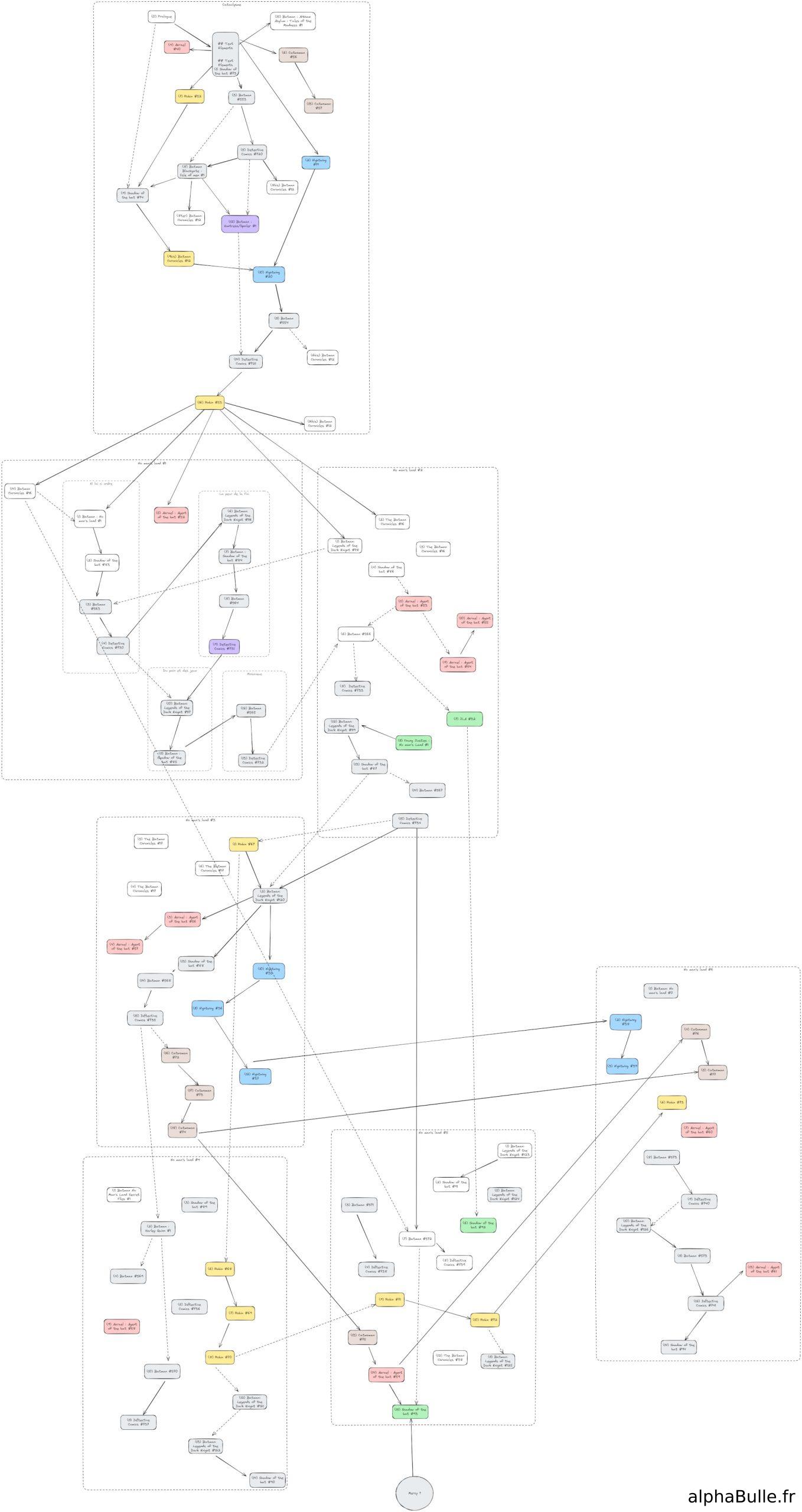 Comme je l’avais indiqué dans ma critique de Batman Cataclysme, qui est le socle de toute la saga No Man’s Land, je me suis amusé au fil de ma lecture à noter les différentes issues rassemblés tout au long de ces 6 tomes, ainsi que leurs liens entre eux.