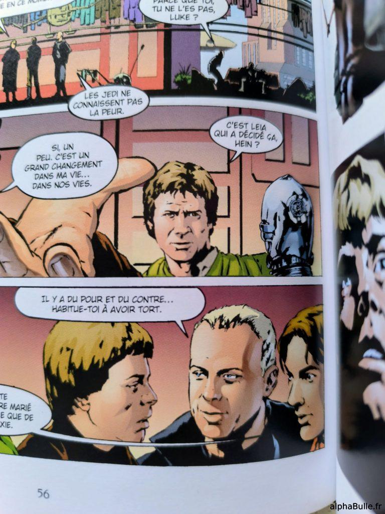 Du côté des dessins, nous avons également du bon et du moins bon. Dans un style assez réaliste, les personnages, décors et costumes sont magnifiques. Les personnages issus des films originaux sont tout à fait identifiables, tandis que les personnages issus de l’univers étendus disposent de leur design propre et reconnaissable (d’ailleurs, je ne sais pas si c’est moi, mais je trouve que Kam Solusar ressemble furieusement çà Bruce Willis, non ?). Mais à l’inverse, le charadesign des personnages secondaires est beaucoup plus discutable, les rendant assez difficile à discerner les uns des autres.