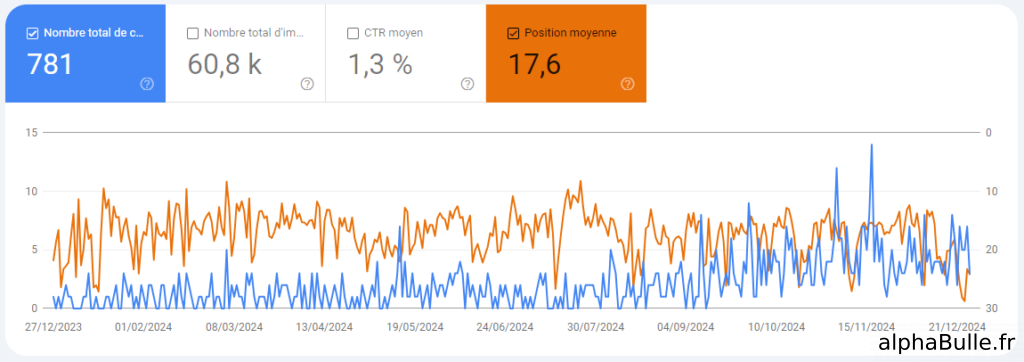Généralement, les webmasters ne partagent pas tellement leurs statistiques. Mais je ne vois personnellement pas de raison de ne pas le faire, alors voici deux petits graphes pour l’année 2024…
