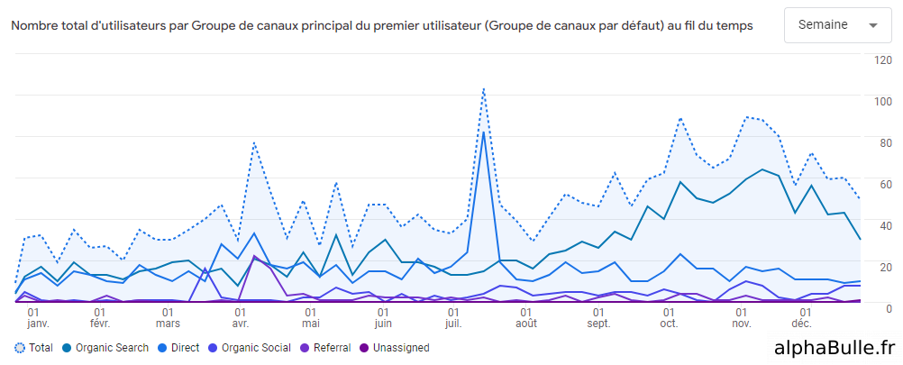 Ce premier graphique indique le nombre de visiteurs (par semaine). L’on peut faire deux constats simples. Primo, le nombre de visiteurs augmente nettement à partir du milieu de l’année, avec une moyenne d’une petite dizaine de personnes par jour. Secundo, cette hausse est liée aux « organic search » : en effet, les visiteurs arrivent de plus en plus sur alphaBulle via des moteurs de recherche.