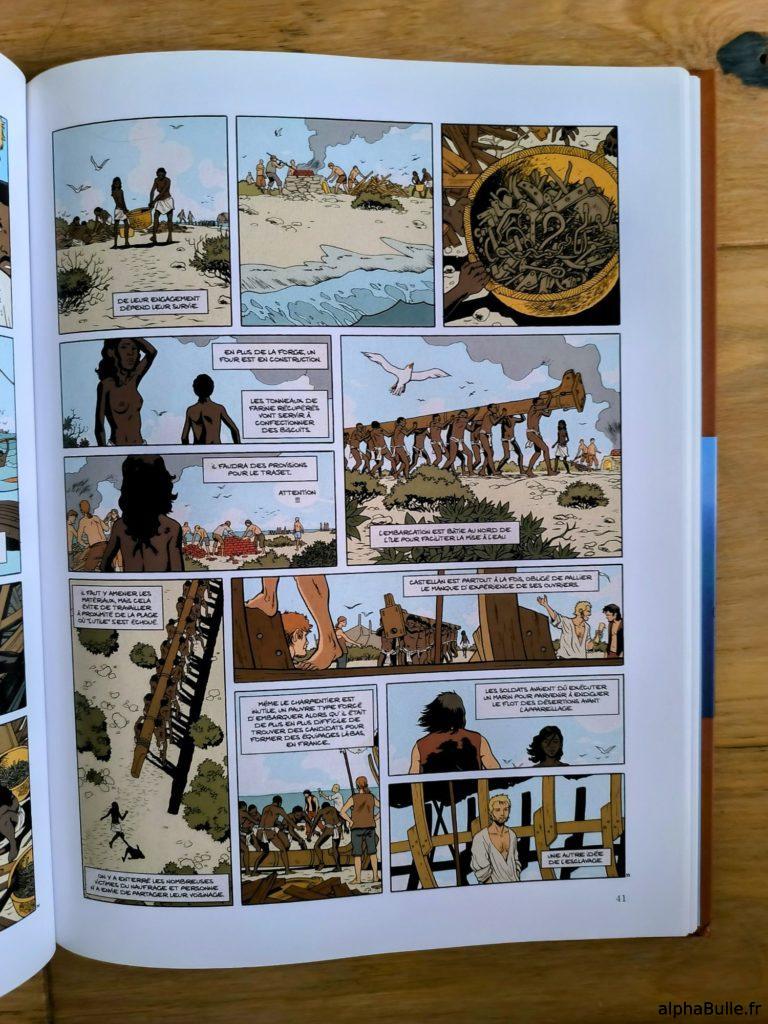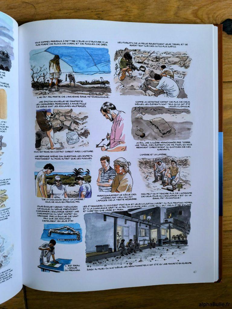 L’album (en deux parties séparées de 15 ans) s’achève sur un épilogue et des annexes précieuses, qui complètent la bande dessinée par des éléments factuels sur la réponse (ou plutôt l’absence de réponse) de la France face au drame des naufragés. Refus de secours, promesses non tenues, et lente réhabilitation mémorielle : autant d’éléments que le lecteur découvre en marge du récit principal. C’est d’ailleurs dommage (même si c’est sans doute un parti pris) : quitte à manipuler une double chronologie, esclaves et archéologues, il aurait été intéressant d’y adjoindre une troisième, le point de vue des français contemporains du naufrage.