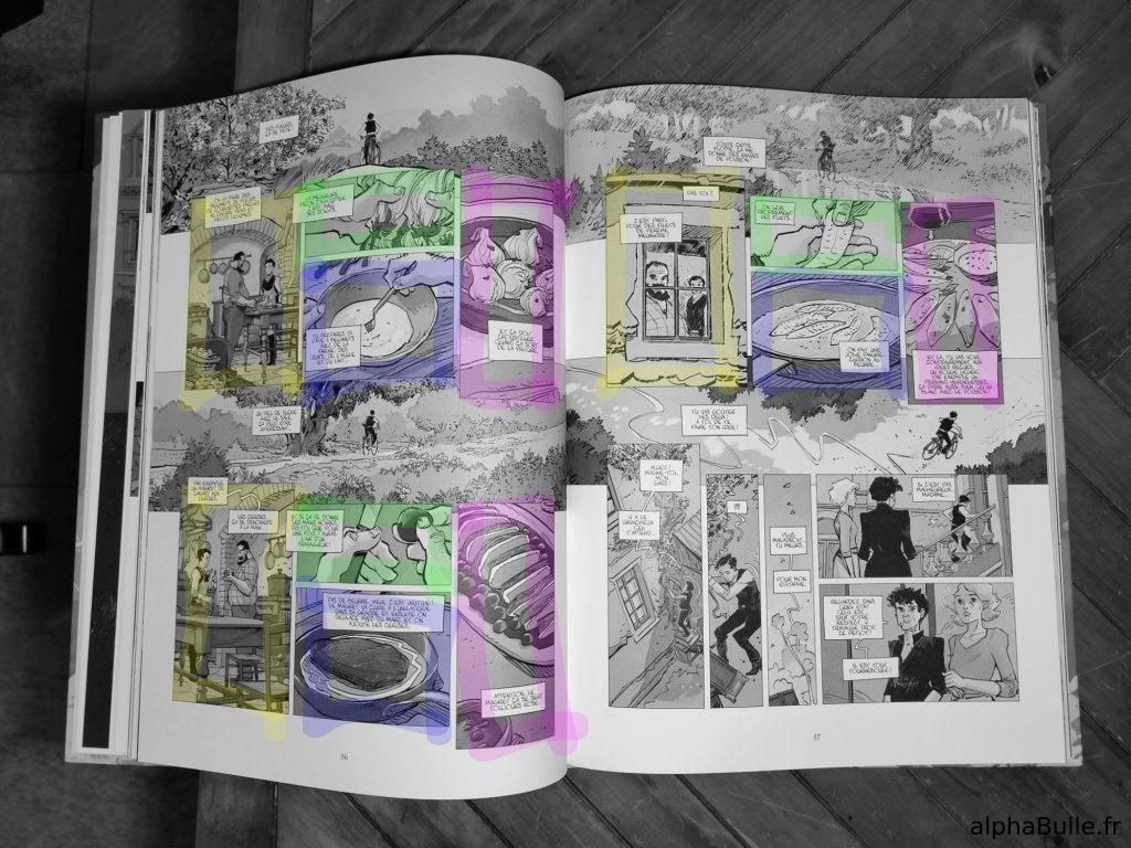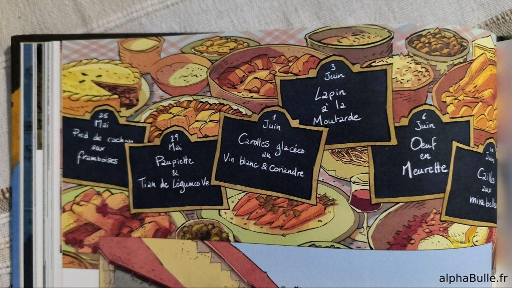 Trois recettes apparaissent (plus ou moins discrètement) dans l’album et illustrent la philosophie culinaire : la terrine de lapin de titane, les œufs en meurette et le poulet aux écrevisses (que je compte bien essayer !). Les recettes détaillées de ces plats sont proposées par les auteurs en guise de postface de l’album.